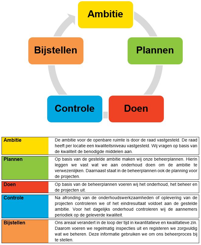 Het beheer van de openbare ruimte is een complex proces met vele belanghebbenden. Dit vraagt om een gestructureerde aanpak. Gekozen is om van grof naar fijn te werken. De raad heeft de Visie Beheer Openbare Ruimte vastgesteld. In deze visie is vastgelegd op welk kwaliteitsniveau de openbare ruimte op welke locatie wordt onderhouden.