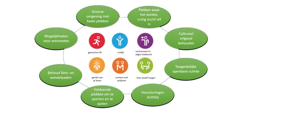 In de afbeelding zie je op welke manier de inrichting van onze omgeving bij kan dragen aan onze gezondheid.