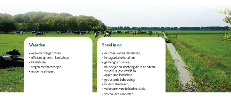 in de gebieden met de tussenkleur groen zijn waarden aanwezig voor modern, agrarisch gebruik alsmede landschapswaarden die van belang zijn voor natuur, beleving en recreatie.