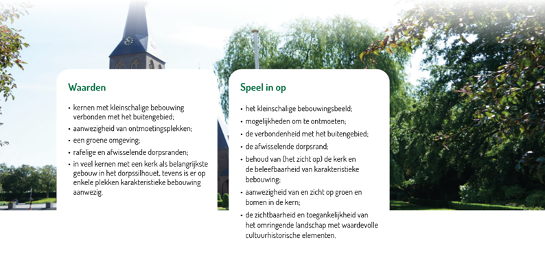 Elke kern heeft zijn eigen specifieke kenmerken. In het proces van MijnDinkelland2030 denken en werken de kernen al een aantal jaren aan wat zij belangrijk vinden voor de leefbaarheid van hun kern. Hierbij geldt dat er sprake moet zijn van een maatschappelijke meerwaarde voor het dorp zelf. Niet de stenen, maar de ontmoeting en activiteiten die daar uit voortkomen zijn bepalend. Zowel voor inwoners als voor bezoekers.