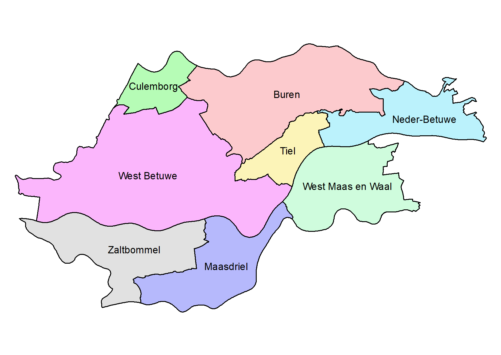 Figuur 1.1 De gemeenten in de regio Rivierenland: Buren, Culemborg, Maasdriel, Neder-Betuwe, Tiel, West Betuwe, West Maas en Waal en Zaltbommel