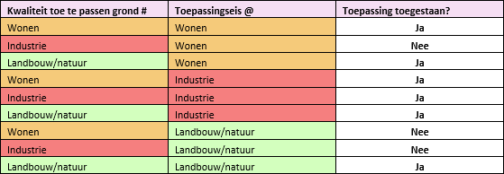 Om te beoordelen of het toepassen van grond is toegestaan wordt de kwaliteit van de toe te passen grond vergeleken met de toepassingseis die geldt voor de ontvangende bodem. De kwaliteit van de toe te passen grond kan worden bepaald op basis van een bodemkwaliteitskaart, partijkeuring of een ander erkend bewijsmiddel. De toepassingseis kan worden bepaald op basis van de bodemkwaliteitskaart (gezoneerde gebieden) of bodemonderzoek van de ontvangende bodem (niet gezoneerde gebieden).
