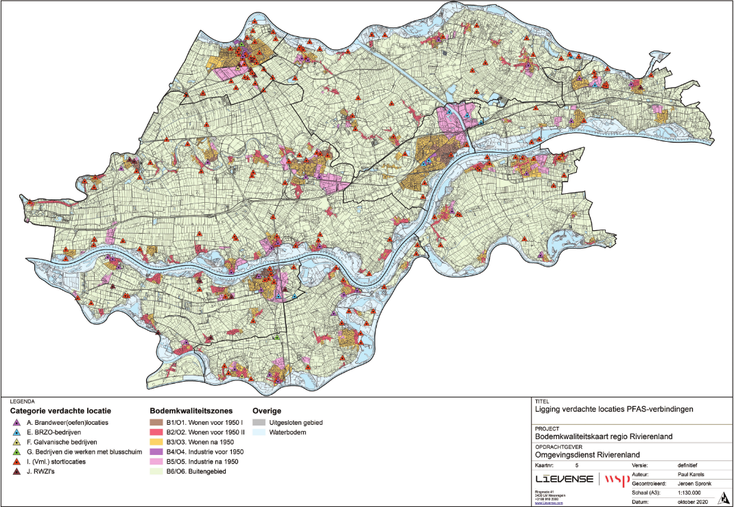 Locaties waar vanwege (bedrijfs)activiteiten PFAS-verbindingen in verhoogde gehalten in de bodem kunnen voorkomen (PFAS producerende4 en verwerkende bedrijven5 , inzet blusschuim6 en secundaire bronnen7 ). Op kaartbijlage 5 zijn de bij de Omgevingsdienst Rivierenland bekende locaties weergegeven die verdacht zijn voor verhoogde gehalten aan PFAS-verbindingen.