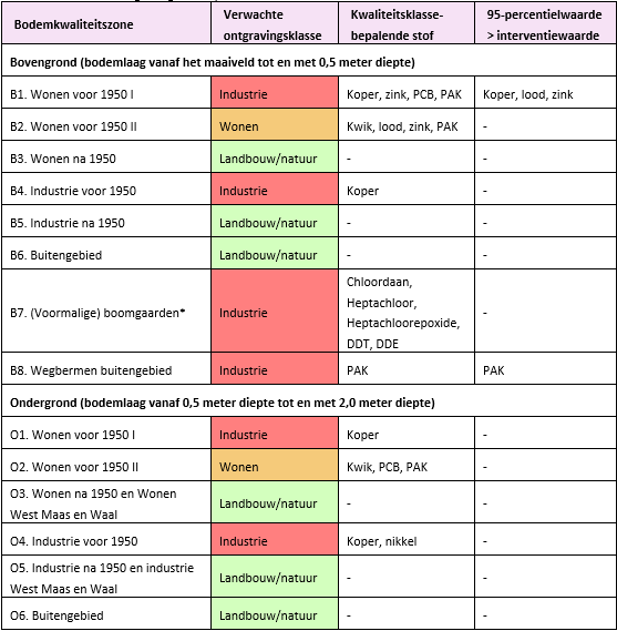 De onderscheiden voorlopige deelgebieden zijn weergegeven in tabel 3.1. Er is een indeling gemaakt voor de bovengrond (vanaf het maaiveld tot en met 0,5 meter diepte) en de ondergrond (vanaf 0,5 meter diepte tot en met 2,0 meter diepte). In deze bodemkwaliteitskaart wordt ook de bodemlaag (vanaf het maaiveld tot en met 0,25