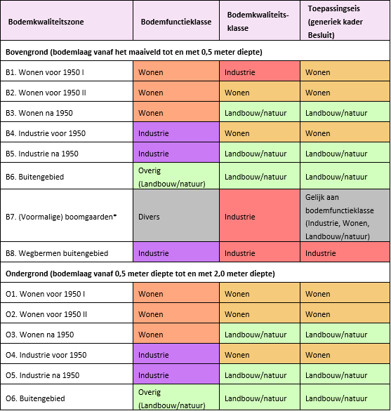 In het Besluit bodemkwaliteit worden bodemkwaliteitszones afhankelijk van de gemiddelde kwaliteit ingedeeld in één van de drie onderscheiden bodemkwaliteitsklassen: