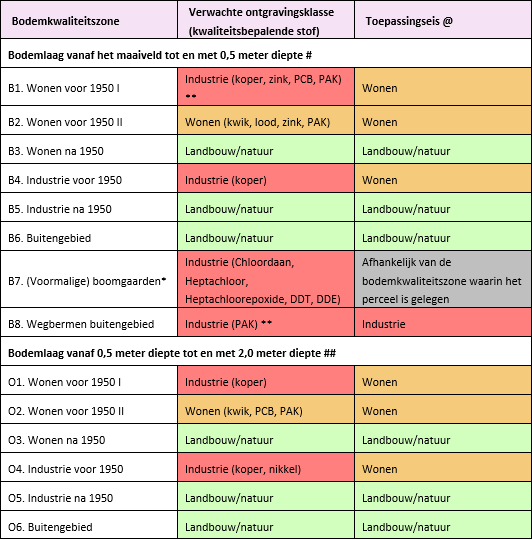 De gemiddelde gehalten van de bodemkwaliteitszones (zie bijlage 4, kolom 'Gem') zijn getoetst aan de normen uit de Regeling bodemkwaliteit[bronvermelding 11] hierna aangeduid als ‘de Regeling’. De bodemkwaliteitszones kunnen vallen in de bodemkwaliteitsklasse ‘Landbouw/natuur (Achtergrondwaarden - AW2000)’, ‘Wonen’ of ‘Industrie’. De toetsingsmethodiek voor het bepalen van de bodemkwaliteitsklasse is opgenomen in bijlage 1 onder het kopje ‘Bodemkwaliteitsklasse’. De toetsingsmethodiek voor het bepalen van de kwaliteitsklasse ‘Wonen’ is voor de bodemkwaliteitsklasse minder streng dan de toetsingsmethodiek voor het bepalen van de ontgravingsklasse (zie ook § 3.8.3 en bijlage 1 onder het kopje ‘Ontgravingskaart’). Met de minder strenge toets wordt voorkomen dat de bodemkwaliteit van een gebied op basis van één stof wordt ingedeeld in de bodemkwaliteitsklasse ‘Industrie’. Dit zou in de praktijk de ongewenste situatie kunnen opleveren dat ook voor alle overige stoffen minder strenge regels gelden en de concentraties kunnen toenemen tot de maximale waarden voor de functie Industrie. Hierdoor verslechtert de kwaliteit van het gebied. Dit doet zich met name voor bij licht verontreinigde industriegebieden.