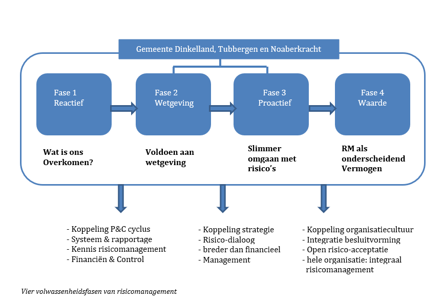 Het risicomanagement van de gemeenten Dinkelland, Tubbergen en Noaberkracht bevindt zich op dit moment deels in fase 2 en deels in fase 3. We voldoen aan de wettelijke verplichting, maar het risicomanagement maakt nog niet integraal deel uit van de besluitvormingsprocessen.