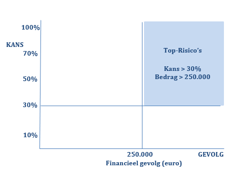 Het instrumentarium (zie bijlage C) ondersteunt dit proces. Door de juiste rolneming (zie bijlage B) wordt er daarbij voor gezorgd dat in de gesprekken ook voldoende ‘tegendenkkracht’ is georganiseerd. Afhankelijk van de kans en de impact kan er sprake zijn van een TOP-risico (zie bijlage C). Dit zijn risico’s meteen forse impact (financieel en/of imago en doelstelling), die daarom qua gesprek, beheersing en rapportage extra aandacht krijgen.
