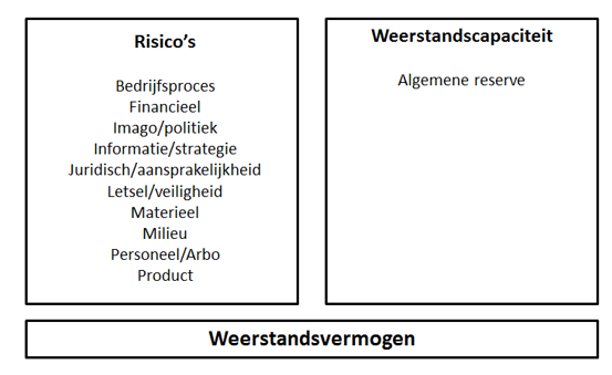 Om te bepalen of het weerstandsvermogen toereikend is, dient de relatie te worden gelegd tussen de financieel en niet-financieel gekwantificeerde risico's en de daarbij gewenste weerstandscapaciteit en de beschikbare weerstandscapaciteit. De relatie tussen beide componenten wordt in onderstaande figuur weergegeven.