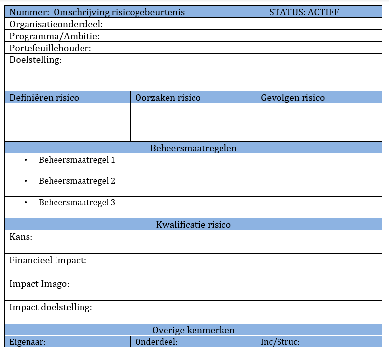 Op het risicoblad wordt het risico systematisch uitgewerkt. De belangrijkste onderdelen zijn: