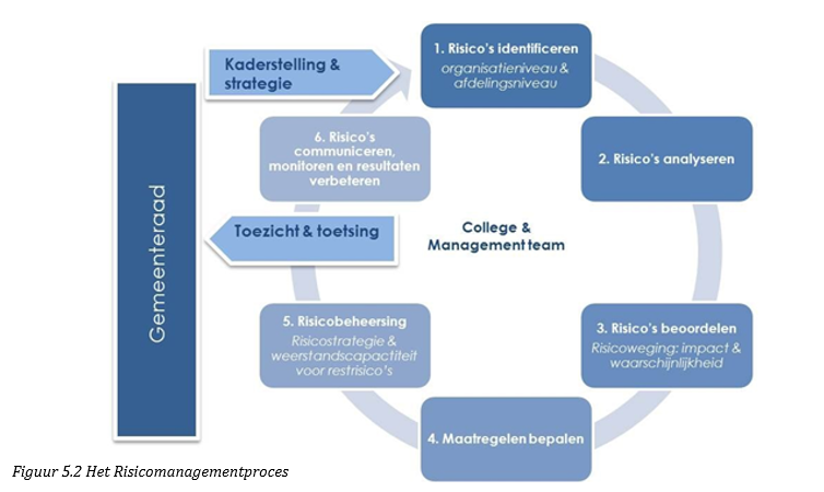 Om risicomanagement goed in te kunnen vullen, is het wenselijk dat voor iedereen duidelijk is hoe het proces van risicomanagement is vormgegeven en welke stappen we daarin onderscheiden. In figuur 5.2 zijn deze inzichtelijk gemaakt. Deze stappen zijn weliswaar volgordelijk maar in de praktijk zullen sommige stappen veelvuldiger voorkomen dan anderen.