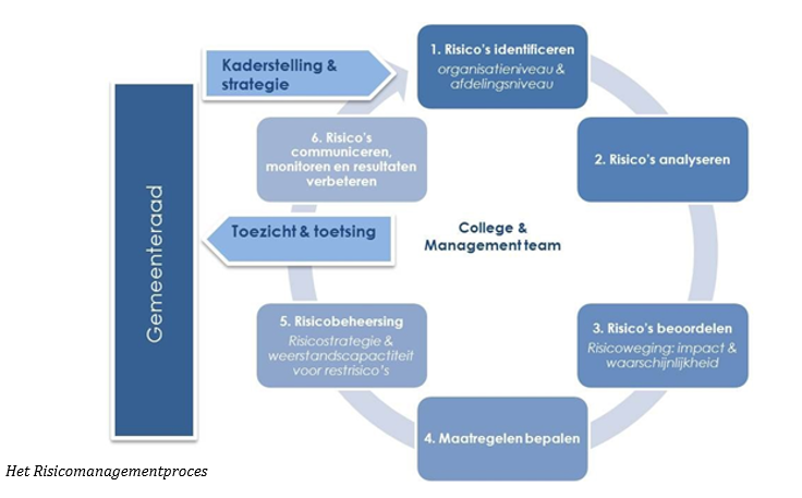 Hoewel toezicht en toetsing een belangrijk onderdeel is van risicomanagement, wordt deze toch buiten de zes stappen genoemd. Dit onderdeel valt buiten de cyclus, omdat het een continuüm is: het doel van continue toezicht is om tijdig (veranderingen in) risico’s te signaleren, adequate maatregelen te kunnen treffen en waar nodig bij te sturen. Uitgangspunt hierbij is dat hoe eerder een (verandering in een) risico wordt gesignaleerd, hoe beter de gevolgen te beheersen zijn. Gedurende het jaar wordt op verschillende momenten verantwoording afgelegd over de resultaten waar het college van B&W integraal verantwoordelijk voor is. Hierbij wordt aangegeven welke doelen zijn behaald, welke niet en waarom. De resultaten van deze verantwoording zijn input voor nieuwe kaderstelling en strategie.
