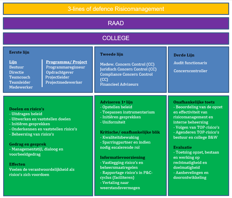 Essentieel is dat de rollen en verantwoordelijkheden goed zijn beschreven en bij een ieder bekend en gedragen worden. Hieronder is aan de hand van het 3-lines of defence model op hoofdlijnen inzichtelijk gemaakt wat de rollen en verantwoordelijkheden zijn en wat de samenhang is binnen en tussen de 3 lijnen. Het 3-lines-ofdefence model is, zoals de naam het al zegt, bedoeld om via drie lijnen te borgen dat risico’s in beeld komen, worden beheerst en daarover het goede gesprek wordt gevoerd.