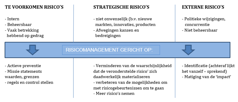 Voor het typeren van de risico’s gebruiken we het model van Kaplan waarin de risico’s worden ingedeeld op basis van de mate waarin beheersing mogelijk en wenselijk is. Daarbij wordt een 3-tal soorten risico’s onderscheiden: