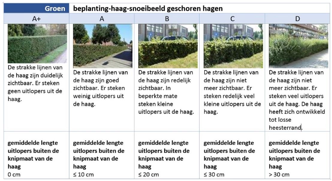 Beeldkwaliteit: De beeldkwaliteit zegt iets over de mate waarin bijvoorbeeld onkruid of overhangende takken aanwezig zijn. A+ staat hierbij voor de hoogste kwaliteit en is arbeidsintensief. D is de laagste kwaliteit en staat gelijk aan geen ondernomen actie. Om de beeldkwaliteit te meten heeft kennisplatform CROW beeldmeetlatten opgesteld (zie hieronder een voorbeeld van een beeldmeetlat voor het snoeien van hagen).