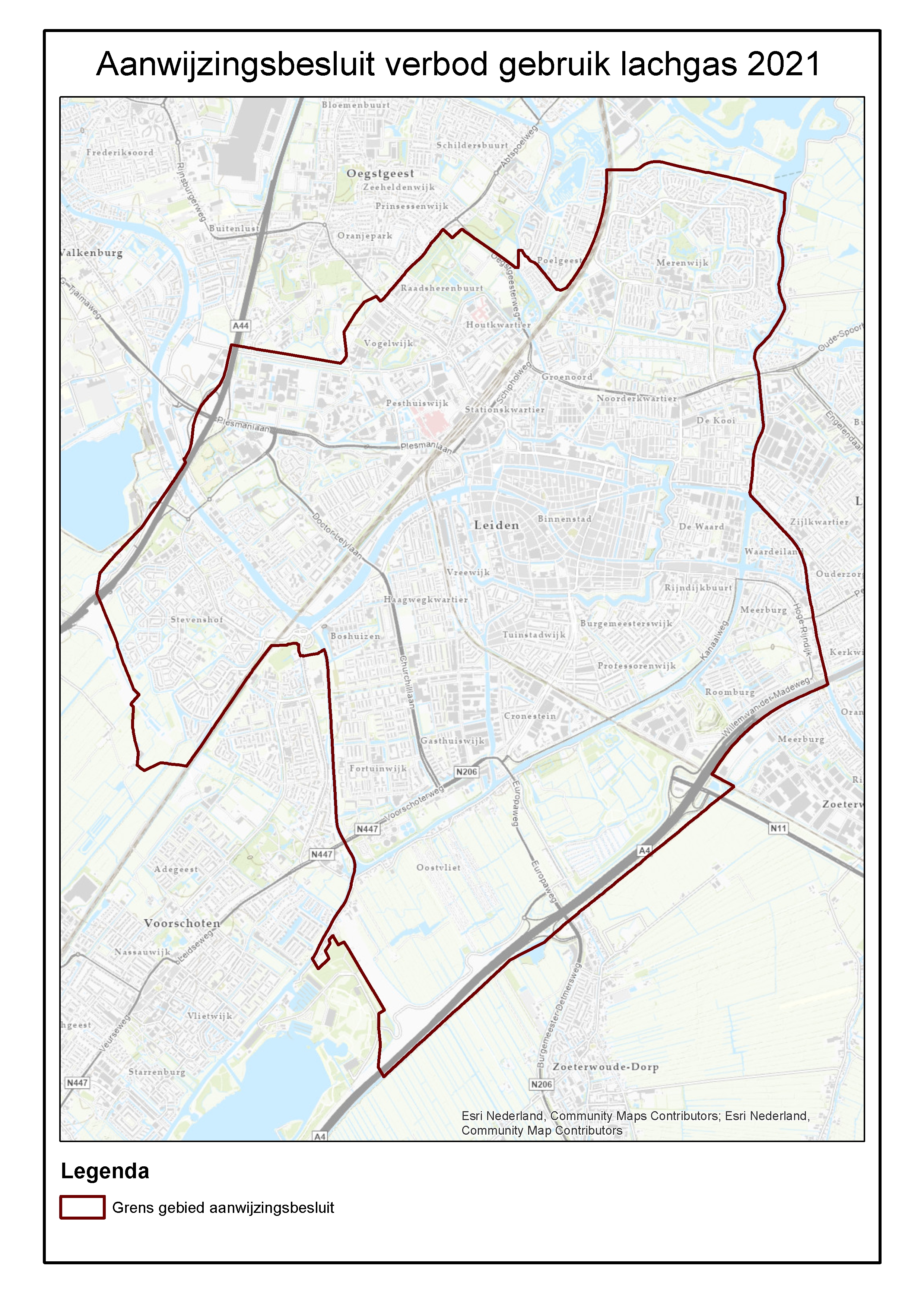 overwegende dat is gebleken dat in de openbare ruimte van de gehele gemeente Leiden - in meer of mindere mate - sprake is van overlast door het gebruik van lachgas, zodat het, mede om verplaatsing van de problematiek te voorkomen en om effectief optreden mogelijk te maken, noodzakelijk is om de gehele gemeente Leiden aan te wijzen als gebied waar het verboden is distikstofoxide (lachgas) te gebruiken;