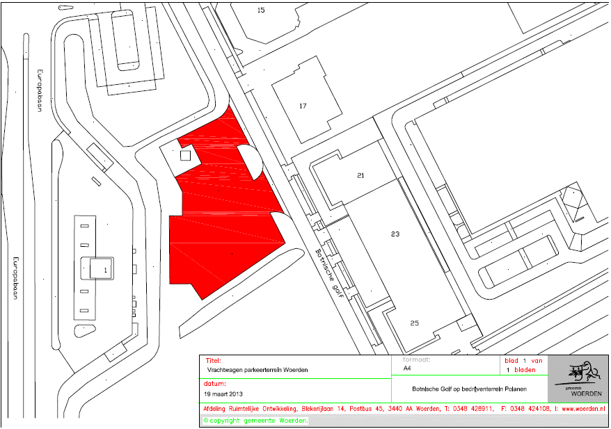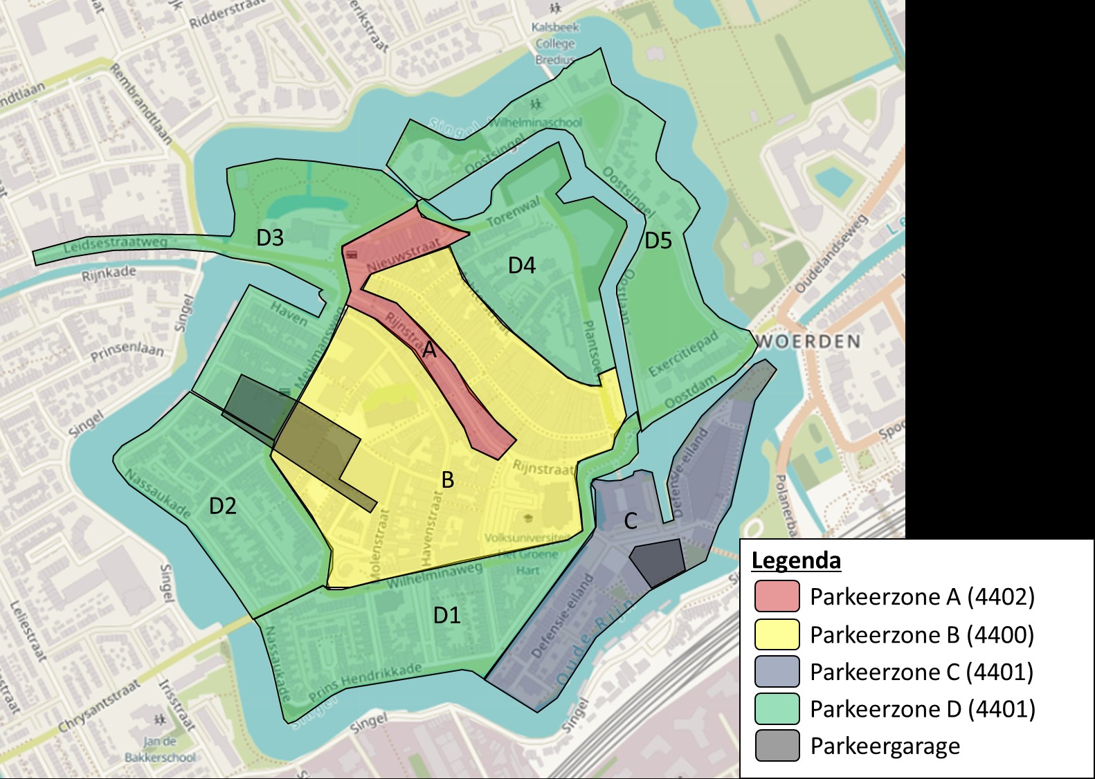 aan te wijzen de volgende weggedeelten en terreinen in de gemeente Woerden aangeduid als plaatsen waarop tegen betaling van belasting door een ieder mag worden geparkeerd: