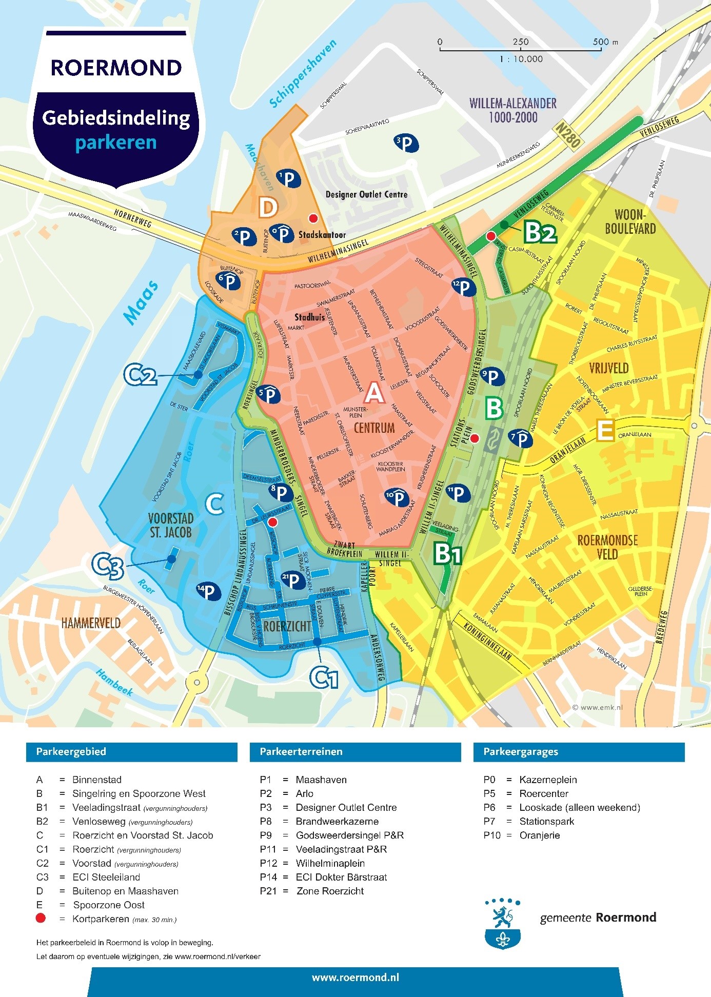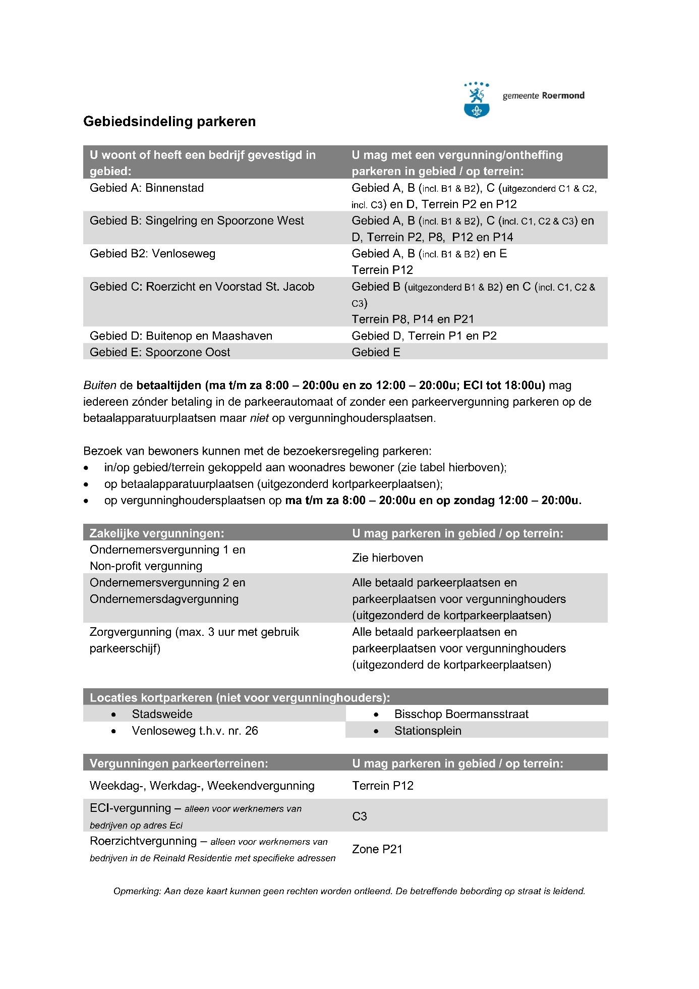 De parkeervergunning kan voor maximaal 3 aaneengesloten uren met gebruik van parkeerschijf gebruikt worden in de gehele Gemeente Roermond (zie ook bijgevoegde plattegrond):