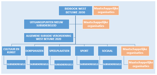 Ten tweede zal de Nota Uitgangspunten Nieuw Subsidiebeleid in het kort worden weergegeven. Het ‘Bidbook West Betuwe 2030’, dat ter voorbereiding van het tot stand komen van de gemeente in overleg met de inwoners is opgesteld, heeft hierbij een belangrijke rol gespeeld.