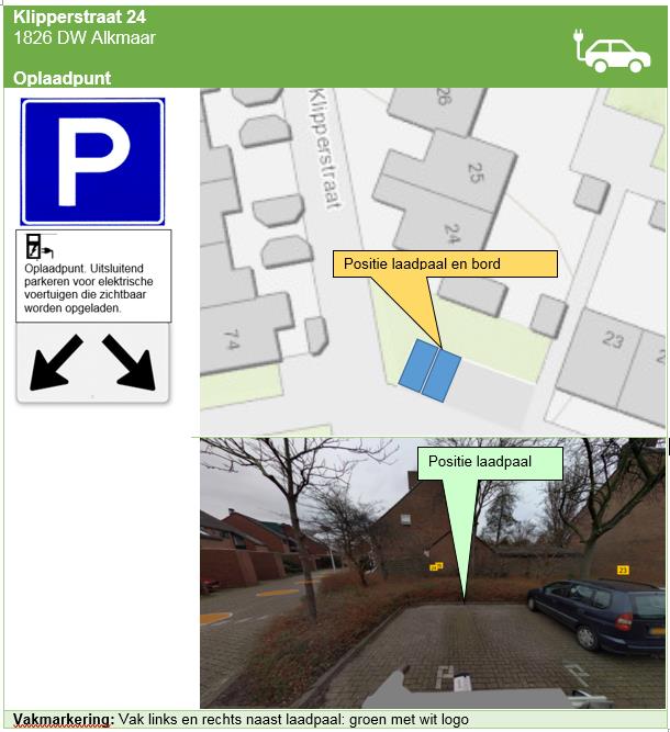 Twee parkeerplaatsen op de Klipperstraat, ter hoogte van nummer 24, aan te wijzen als oplaadpunt voor een elektrisch voertuig. De maatregel zal ter plaatse worden aangeduid door het bord conform model E4 van bijlage 1 van het Reglement Verkeersregels en Verkeerstekens (RVV 1990), op een onderbord zal worden aangegeven voor welke doelgroep en onder welke voorwaarden het gebruik van de parkeergelegenheid geldt. De borden worden geplaatst zoals aangegeven op de bij dit besluit behorende tekening.