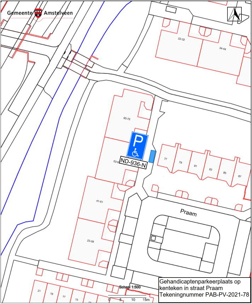 Burgemeester en wethouders van Amstelveen besluiten het parkeren te verbieden op een parkeerplaats in de straat Praam, zoals aangegeven op tekening PAB-PV-2021-78, met uitzondering van het voertuig met het kenteken ND-936-N (gehandicaptenparkeerplaats).