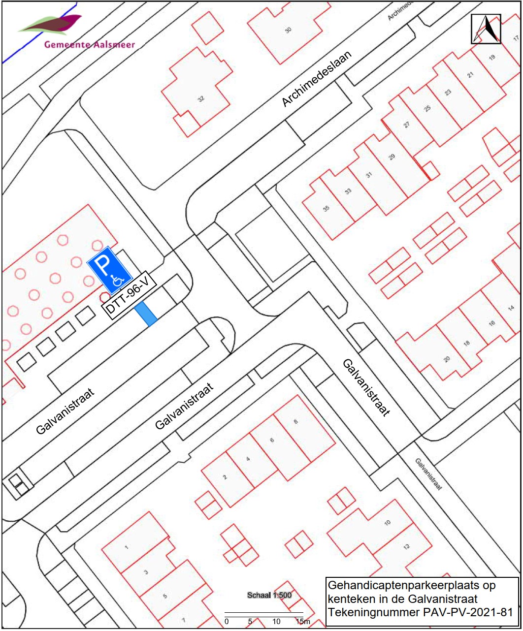 Burgemeester en wethouders van Aalsmeer besluiten het parkeren te verbieden op een parkeerplaats in de Galvanistraat, zoals aangegeven op tekening PAB-PV-2021-81, met uitzondering van het voertuig met het kenteken DTT-96-V (gehandicaptenparkeerplaats).