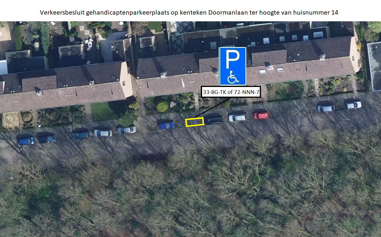 De gemeente heeft het verzoek ontvangen om een parkeerplaats nabij Doormanlaan 14 aan te wijzen als gehandicaptenparkeerplaats op kenteken voor 2 verschillende voertuigen