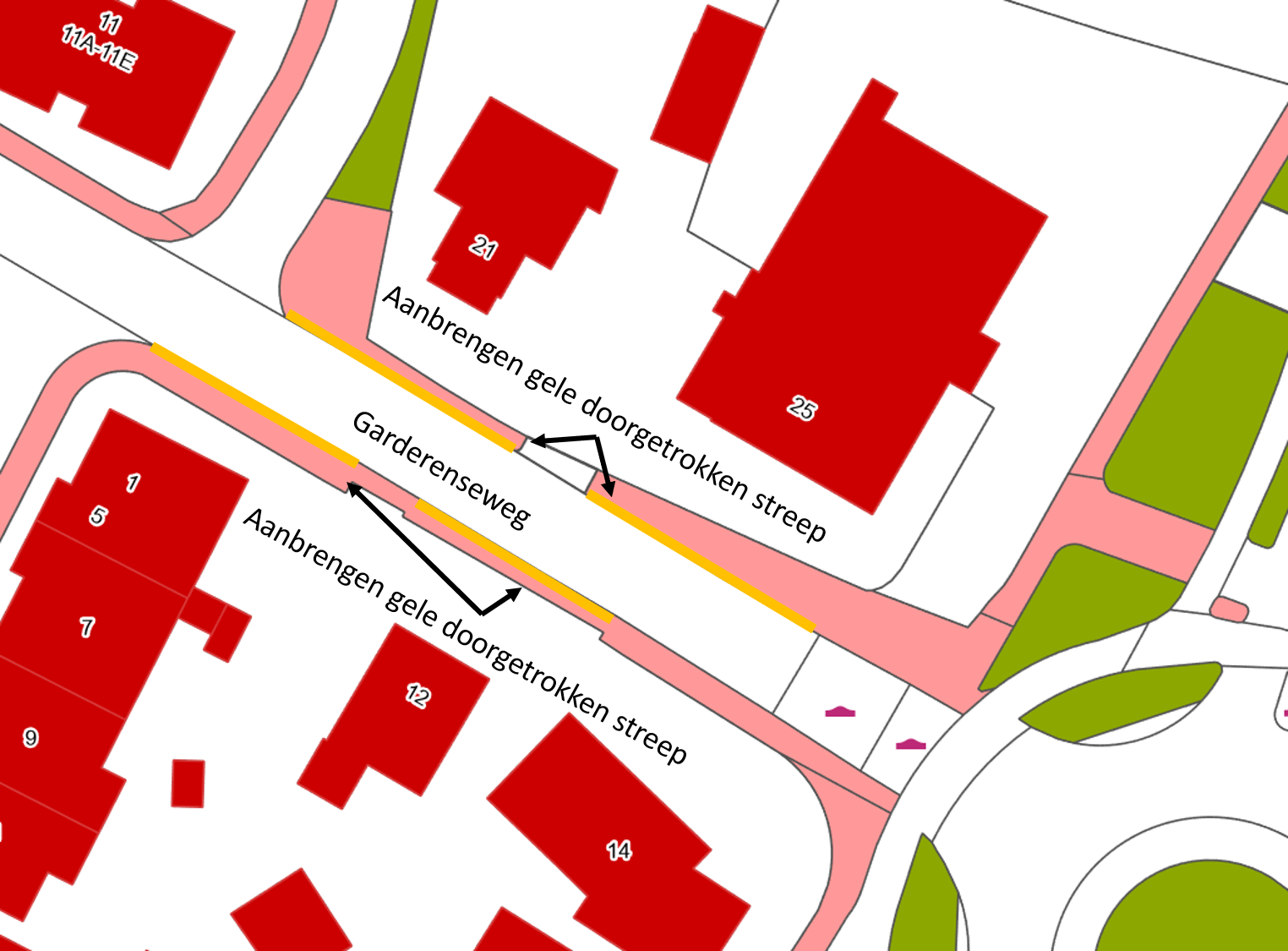 * Het instellen van een stopverbod door middel van het aanbrengen van een gele doorgetrokken streep aan beide zijden van de Garderenseweg tussen de rotonde met de Voorthuizerstraat en het kruispunt met het Klaas Frisohof volgens de bijgevoegde situatietekening.