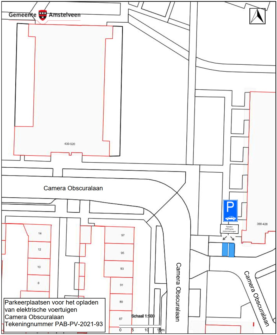 Burgemeester en wethouders van Amstelveen besluiten om in de Camera Obscuralaan twee parkeerplaatsen aan te wijzen als parkeerplaats voor het opladen van elektrische motorvoertuigen. De parkeerplaatsen mogen alleen gebruikt worden voor het opladen van deze elektrische motorvoertuigen.