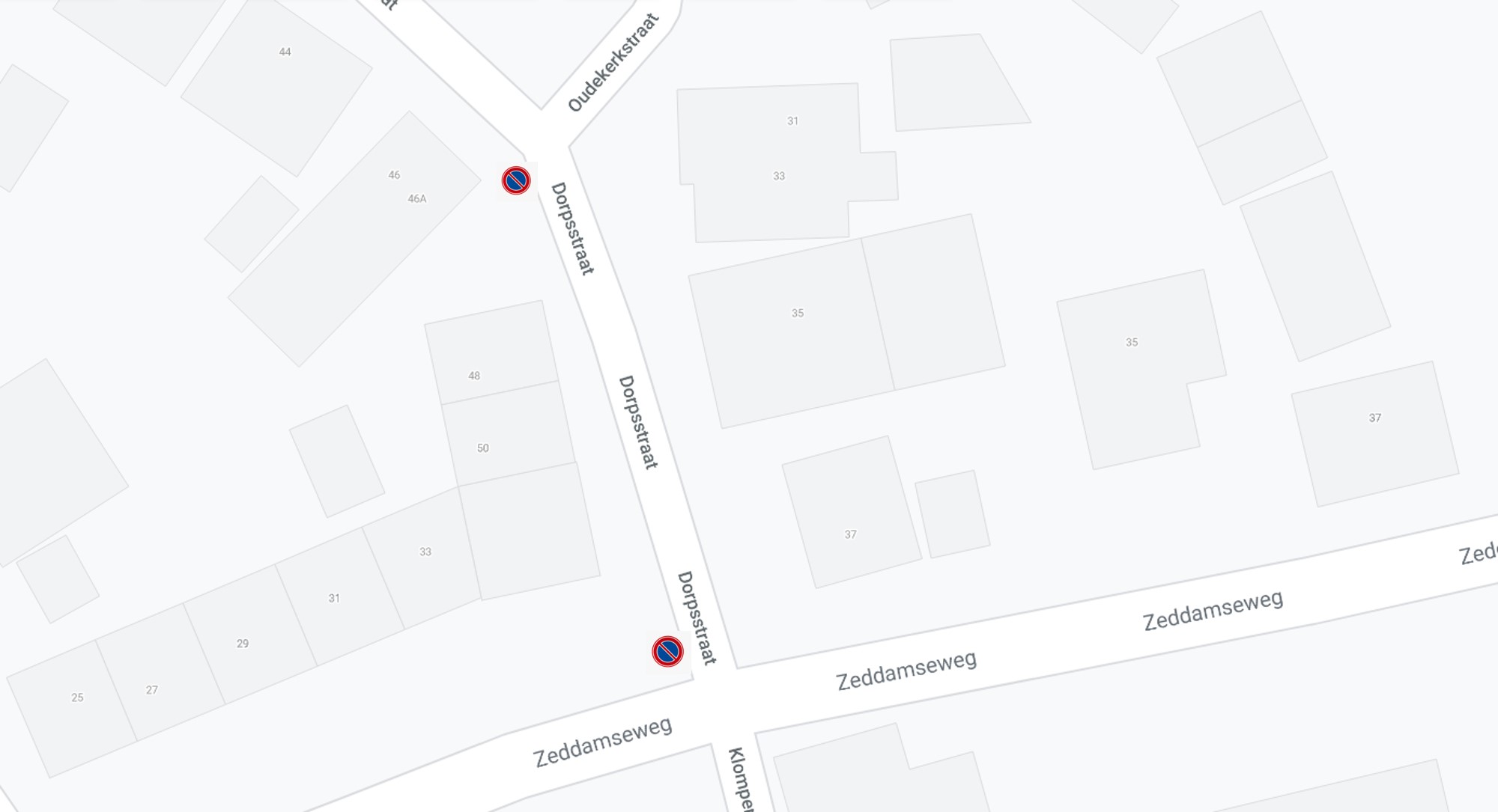 Op de rest van de Dorpsstraat geldt een parkeerverbod aan de andere zijde van de rijbaan zodat het parkeren in de parkeerhavens niet wordt gehinderd.