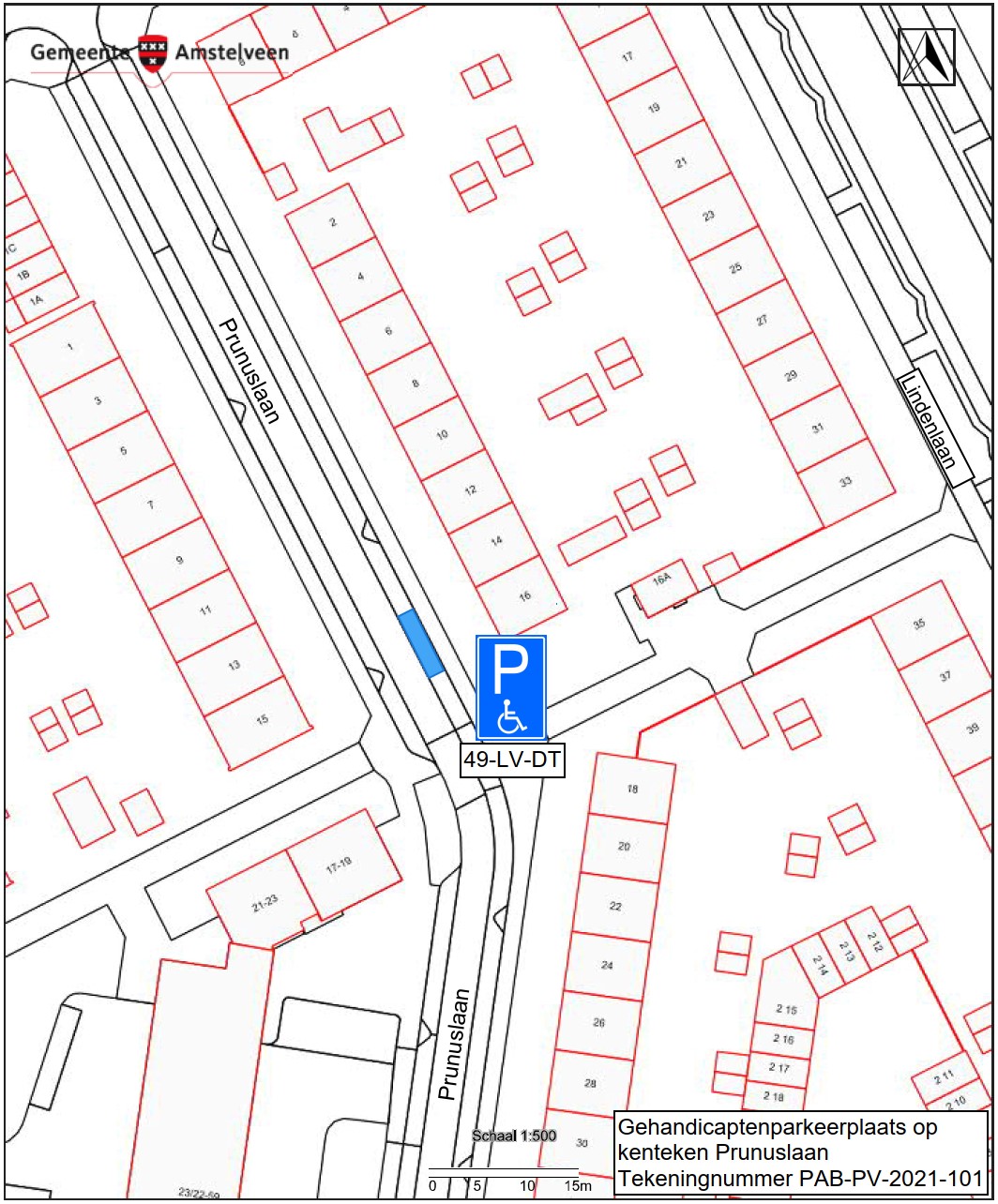 Burgemeester en wethouders van Amstelveen besluiten het parkeren te verbieden op een parkeerplaats in de Prunuslaan, zoals aangegeven op tekening PAB-PV-2021-101, met uitzondering van het voertuig met het kenteken 49-LV-DT (gehandicaptenparkeerplaats).