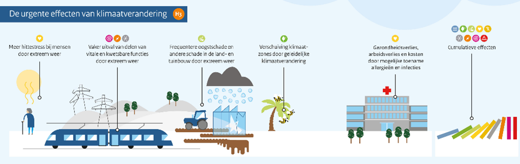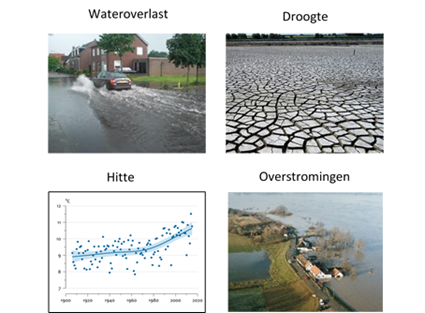 Sommige effecten van klimaatverandering ervaren we nu al in grotere hevigheid dan eerder werd gedacht. Het regent vaak harder en de hoosbuien zorgen voor wateroverlast in steden en op wegen. De kans op een hittegolf neemt toe, hetgeen effect heeft op de volksgezondheid en ook kan leiden tot schade, bijvoorbeeld aan de fruitteelt of infrastructuur. Langdurige droogte leidt tot watertekorten voor de land- en tuinbouw en de natuur en tot lage grondwaterstanden. De extreme weersomstandigheden vormen verder risico’s voor vitale functies, zoals bijvoorbeeld de beschikbaarheid van elektriciteit.