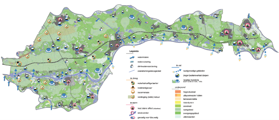 Voor de regio Rivierenland is een klimaateffecatlas (Werkregio Klimaatactief Rivierenland) ontwikkeld. In de klimaateffectatlas wordt in detail bekeken welke risico’s voor verdroging, hitte, wateroverlast en overstroming er zijn. Daarbij worden ook verbanden gelegd op regionaal niveau. Bij welke peilgebieden komt de inlaat droog te liggen bij een lage rivierstand? Welke regio’s hebben veel waterberging beschikbaar en in welke gebieden is juist veel afstroom? En waar liggen natuur- en landbouwgebieden die kwetsbaar zijn voor bijvoorbeeld droogte? De uitkomsten van deze klimaatatlas zijn met iconen op bovenstaande overzichtskaart verwerkt.