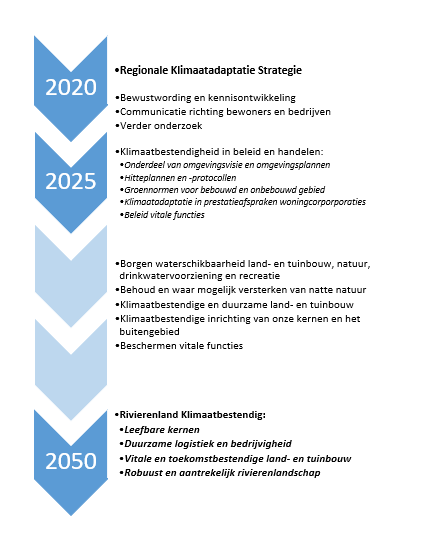 Vanuit deze strategische lijnen op korte termijn, zijn onze ambities geformuleerd om toe te werken naar een klimaatbestendig Rivierenland in 2050: