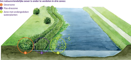 Kenmerk van natuurvriendelijke oevers is dat de overgang van land naar water geleidelijk verloopt. Hierdoor ontstaat er meer ruimte om water te bergen. Hiermee dragen deze natuurvriendelijke oevers bij aan klimaatadaptatie. Bijkomt voordeel is dat de planten die op de oever en in de plas-dras zone staan en de ondergedoken waterplanten zorgen voor een betere waterkwaliteit.