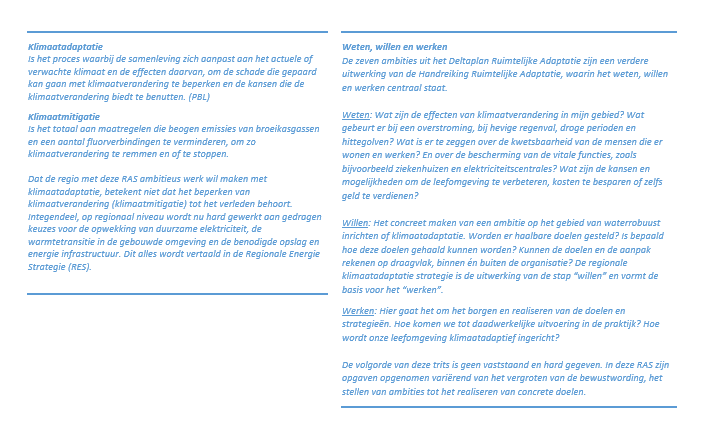 Voor u ligt onze RAS. Met deze strategie zijn we er niet, het is slechts een begin. De uitwerking van de opgaven en maatregelen zijn er op gericht dat wij als regio ons daadwerkelijk kunnen aanpassen aan de klimaatverandering en daar ook naar gaan handelen. Dat is niet alleen een taak van ons als overheden. Een grote verantwoordelijkheid ligt bij ons als gehele maatschappij: van individuele inwoner tot ondernemer, van natuurorganisatie tot woningcorporatie, van land- en tuinbouw tot logistiek.
