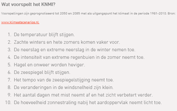 Het wordt steeds natter, warmer, er zijn langere droge periodes en de zeespiegel stijgt. Het KNMI heeft scenario’s opgesteld die duidelijk maken dat we ons moeten voorbereiden op extremere weersomstandigheden die kunnen leiden tot grote ruimtelijke, economische, ecologische en maatschappelijke impact.