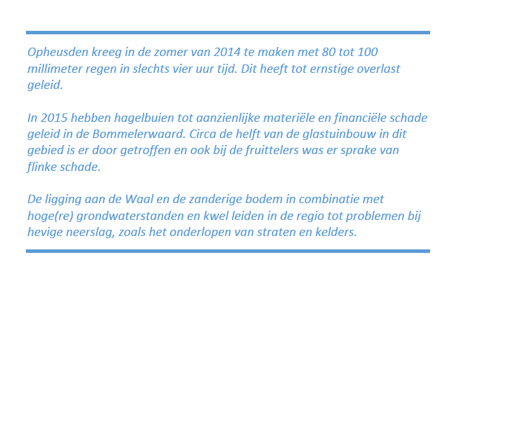 De inhoudelijke thema’s die horen bij klimaatadaptatie hebben betrekking op wateroverlast, droogte, hitte en het risico op overstromingen. De combinatie van hoog water, kwel en woongebieden vlak achter de dijk maakt het Rivierengebied extra kwetsbaar voor klimaatveranderingen. Op basis van de uitgevoerde regionale stresstesten in de regionale klimaateffectatlas (Werkregio Klimaatactief Rivierenland) en de risicodialogen concluderen wij dat Rivierenland gevoelig tot zeer gevoelig is voor alle klimaateffecten.