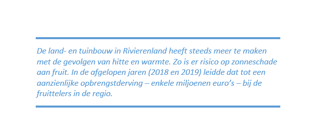 Als regio staan we voor de opgave om ons aan te passen aan het klimaat en om de schade die hiermee gepaard gaat te beperken. Tegelijkertijd moeten we de kansen die klimaatverandering met zich mee brengt benutten. Denk daarbij aan het verbouwen van andere producten en een langere oogstperiode.
