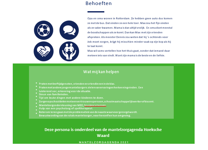 Jonge mantelzorgers zijn graag in contact met andere jongeren en willen leuke dingen doen, bezig zijn met hun hobby’s. Het gaat hierbij om gezelligheid maar ook dat ze zich herkend en gewaardeerd voelen. Alle kinderen hebben in de gesprekken aangegeven dat praten over hun situatie met iemand die ‘ongeveer’ hetzelfde meemaakt kan helpen. Zij vinden het belangrijk om hun verhaal te delen en erkenning te krijgen van een ander.