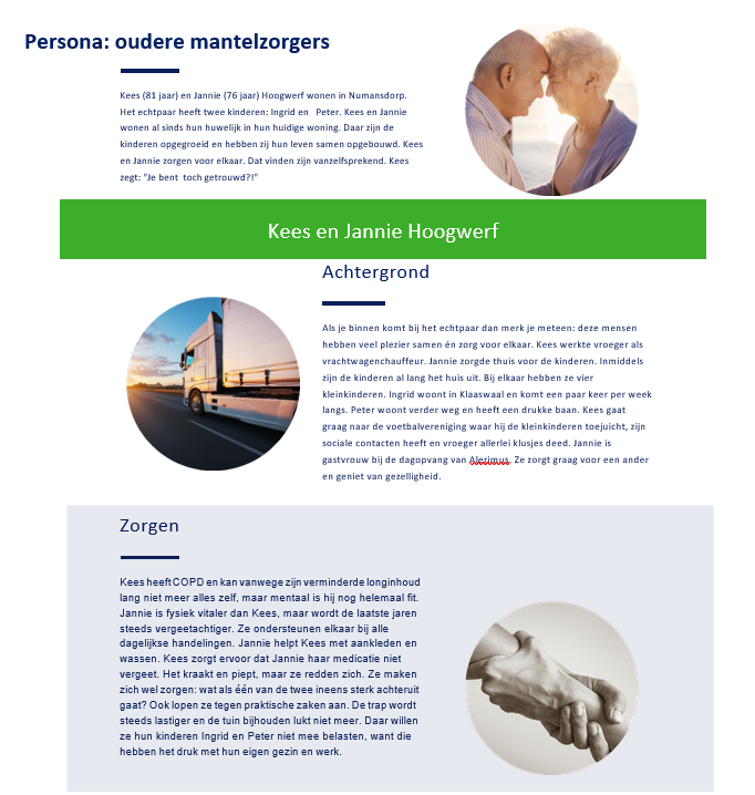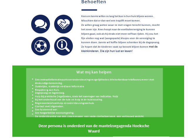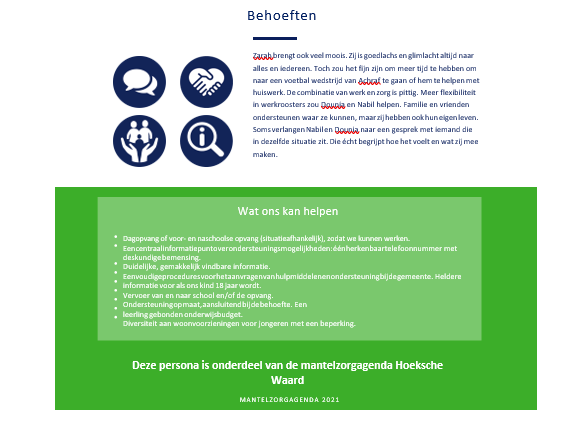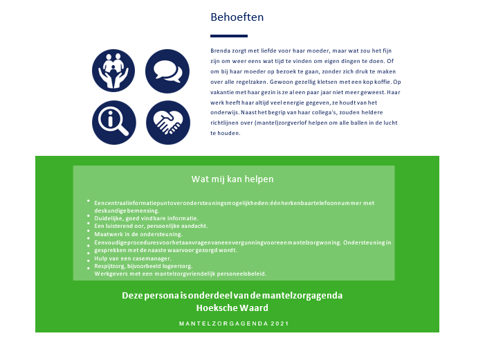 De beschrijvingen van de persona’s zijn getoetst bij de mantelzorgers die we hebben gesproken. De ondersteuningsbehoeften (‘Wat mij kan helpen’) zijn een weergave van de hoofdlijnen uit de gevoerde gesprekken: we hebben de meest genoemde en een aantal zeer specifieke ondersteuningsbehoeften vermeld op de vraag wat er nodig is om het mantelzorgen makkelijker te maken en (langer) vol te houden. Een volledige beschrijving van de uitkomsten is terug te vinden in bijlage 2.
