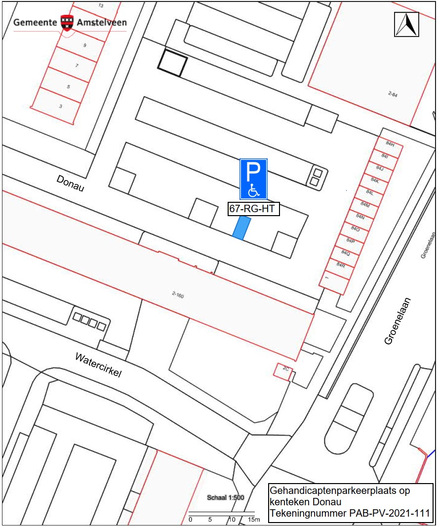 Burgemeester en wethouders van Amstelveen besluiten het parkeren te verbieden op een parkeerplaats in de straat Donau, zoals aangegeven op tekening PAB-PV-2021-111, met uitzondering van het voertuig met het kenteken 67-RG-HT (gehandicaptenparkeerplaats).