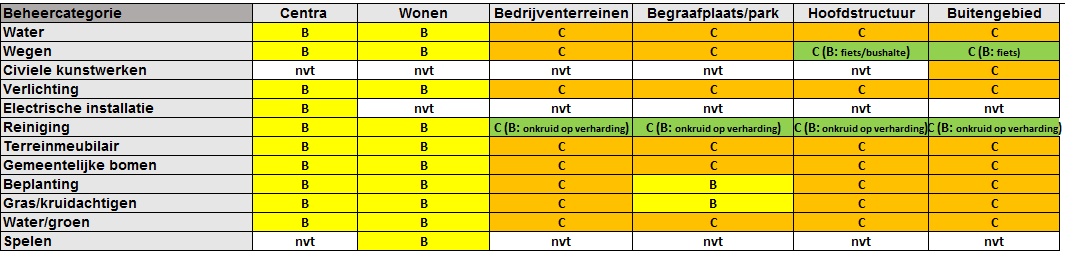 Centra en woonwijken worden onderhouden op B kwaliteit, waarbij de minder in het oog springende onderdelen op een lager niveau worden beheerd (C). Indien de noodzaak aanwezig is om hier in te grijpen, wordt dit gedaan door een eenmalige ronde in het rustige seizoen of door middel van een voorstel aan het college of de raad om hiervoor financiële middelen vrij te maken. De overige gebiedstypen worden onderhouden op C kwaliteit, met uitzondering van het groen op de begraafplaatsen/parken en fietspaden. Deze worden onderhouden op B-kwaliteit. Voor onkruidbestrijding op verharding geldt dat de gehele gemeente op B-kwaliteit wordt onderhouden.