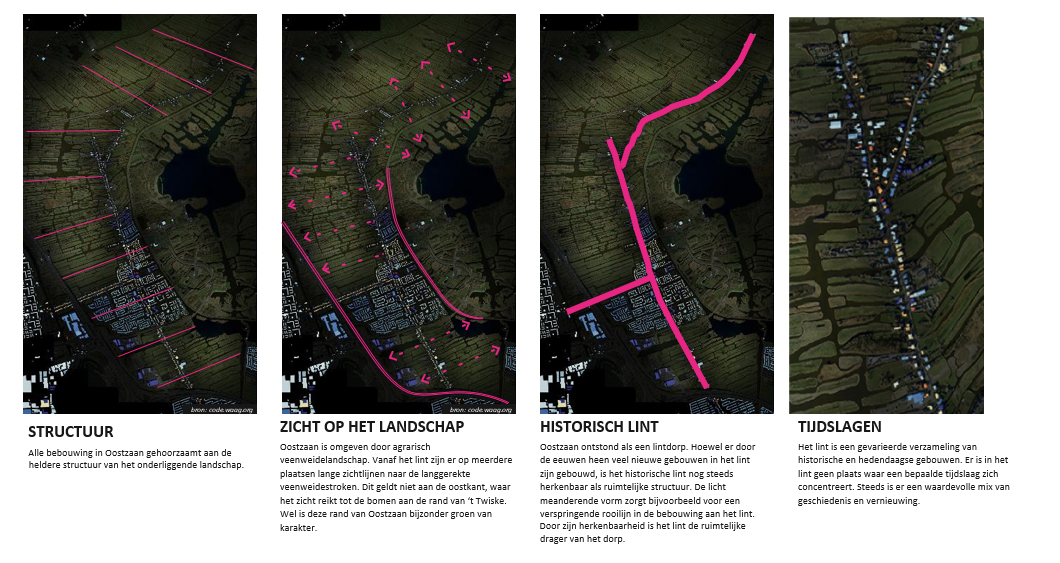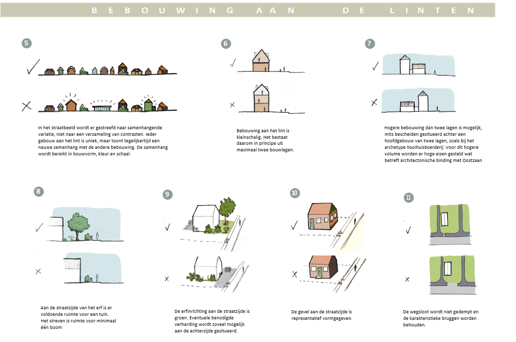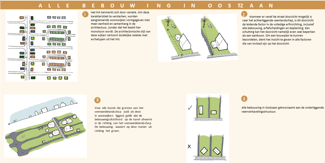 Ten slotte worden in hoofdstuk 4. Uitgangspunten elf uitgangspunten geformuleerd die gebaseerd zijn op de voorgaande hoofdstukken. Hierbij is onderscheid gemaakt tussen uitgangspunten die gelden voor alle bebouwing in Oostzaan en bebouwing aan de linten. Met de linten wordt gedoeld op de straten De Haal, De Heul, Noordeinde, Kerkbuurt, Kerkstraat en Zuideinde. De uitgangspunten geven kort en bondig weer hoe de ruimtelijke kwaliteit van Oostzaan gewaarborgd en waar mogelijk versterkt wordt bij nieuwe ontwikkelingen. Dit betekent niet dat hiermee het belang van de voorgaande hoofdstukken vervalt. Plannen worden gemaakt en beoordeeld in de bredere context, dus ieder hoofdstuk dient te worden meegenomen door beide partijen. Hierdoor ontstaat er ruimte voor dialoog, in plaats van een een harde beoordeling op basis van specifieke regels.