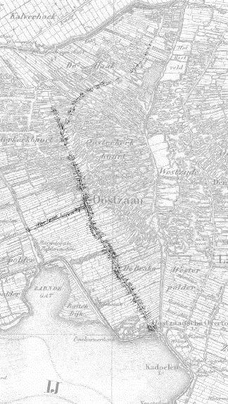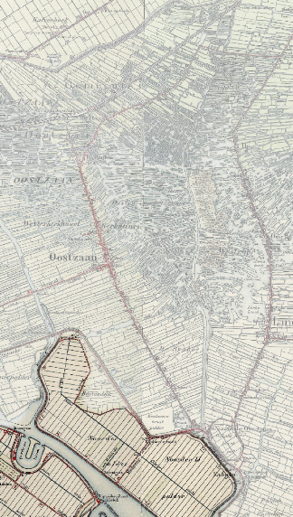 Het dorp Oostzaan ontstaat in de 11e tot de 13e eeuw door ontginningen ten oosten van de Zaan. Bovenstaande kaart toont het typisch Noord-Hollandse lintdorp in het jaar 1850. Oostzaan bestond toen al uit de buurtschappen Noordeinde, Kerkbuurt, Zuideinde en liep door tot de Oostzaansche Overtoom aan het IJ. Dit buurtschap speelde een belangrijke rol in de walvisvaart tijdens de Gouden Eeuw. Het Weerpad verbond Oost-Zaandam met de Hervormde Kerk in Oostzaan, verbouwd in 1760. Deze verbinding wijst op het belang van de kerk in het gebied.