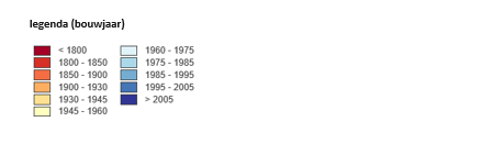De afbeelding toont tevens de bouwperiodes van de bestaande bebouwing. Zo zijn de Hervormde Kerk (rijksmonument), de linten en de nieuwbouwwijken snel aan hun kleur te herkennen. Ook wordt duidelijk dat het historische lint vooral historisch is in zijn structuur. Het lint bevat nog maar enkele gebouwen die voor 1900 zijn gemaakt. Het grootste deel is licht tot donkerblauw gekleurd, en dus na 1960 gebouwd.