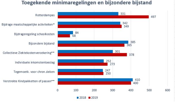 In het figuur hieronder ziet u de toegekende minimaregelingen en bijzondere bijstand. De Rotterdampas en de verstrekte kind pakketten zijn aan dit figuur toegevoegd.