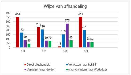 Hierbij moet wel opgemerkt worden dat de gezamenlijke data van de organisaties van Wadwijzer, de gebruikte applicatie voor de registraties van deze data en de monitorgegevens nog in ontwikkeling zijn. Zo zien wij bijvoorbeeld dat de cijfers van Q3 met betrekking tot directe afhandeling afwijken. Er wordt in Q3 opvallend meer doorverwezen naar derden.De oorzaak hiervoor is op dit moment nog onbekend.