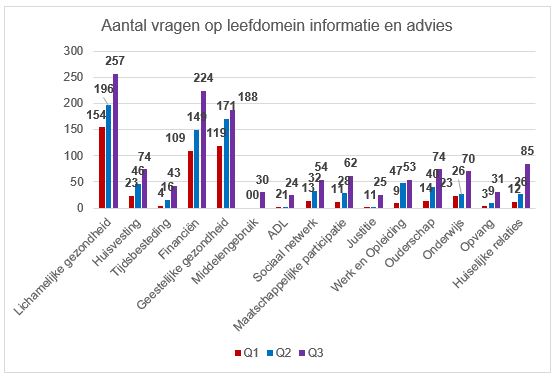 In de onderstaande tabel wordt per kwartaal weergegeven hoeveel vragen per leefdomein zijn ontvangen. De (volledige) gegevens van Q4 ontbreken en zijn daarom niet getoond. In de grafiek hierboven is te zien dat veel van de meest gestelde vragen gaan over de lichamelijke gezondheid, financiën en de geestelijke gezondheid.