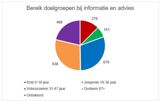 Van de 2204 informatie- en adviesvragen werden de meeste vragen gesteld door ouderen en volwassenen. Door jongeren/jongvolwassenen worden bij deze dienst het minst aantal vragen gesteld. In het geval van ‘onbekend’ is de informatie- of adviesvraag behandeld zonder de noodzaak om dit te vragen, te registreren of nader op te zoeken.